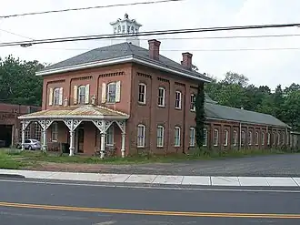 The former H. D. Smith Company complex is located in the Plantsville area of southwestern Southington, on the west side of West Street a short way north of its junction with West Main Street. It is located between West Street and the Eightmile River, which runs at the rear of the property and historically provided the facility's power. The building has two parts, both built out of red brick: the front section is two stories in height, with a truncated hip roof topped by a square cupola, and the rear section is a long single-story gable-roofed structure. The building's bays are articulated as recessed panels, with brick corbelling at the top. The front section has a single-story hip-roof porch extending across its front, with chamfered square posts rising to brackets with jigsawn spandrels. Windows are set in segmented-arch openings, with headers that use alternating red and black bricks.[2]