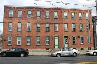 It is a three-story, L-shaped red brick building which sits on a limestone foundation, and has a low-pitched gable roof topped by a weathervane. It was used as a knitting mill until 1956, after which it was used as a warehouse.[2]