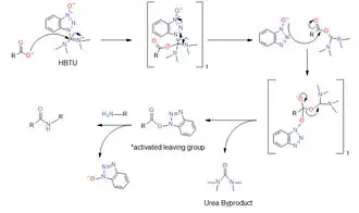To create the HOBt ester, the carboxyl group of the acid attacks the imide carbonyl carbon of HBTU. Subsequently, the displaced anionic benzotriazole N-oxide attacks of the acid carbonyl, giving the tetramethyl urea byproduct and the activated ester. Aminolysis displaces the benzotriazole N-oxide to form the desired amide.[9]
