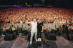 Since 2011, HBz has been performing live regularly, initially mainly on small stages. A notable performance for the duo was the Winterbeats Festival 2020, at the Saturn Arena in Ingolstadt, in which they were voted best act.[18] Festivals they have performed at include Lollapalooza at Olympiastadion Berlin,[19] Parookaville,[20] Sputnik Spring Break,[21] SonneMondSterne,[22] Glücksgefühle Festival at Hockenheimring,[23] Electrisize,[24] Open Beatz Festival,[25] and Heide Park Festival in the amusement park Heide Park.[26] In the Veltins Arena, HBz appeared on stage at the Olé auf Schalke 2022 and also at the Olé auf Schalke 2023 in front of 40,000 people each.[27]