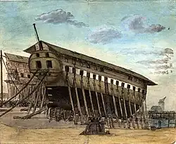Thetis was built at Nyholm to a design by Andreas Schifter. Diderich Funck was responsible for overseeing the actual construction.[1] She was laid down in 1836 and the construction ended in 1841. She was launched on 30 April 1840.[2]