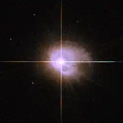 HD 101584 is a suspected post-common envelope binary about 1,800 to 5,900 light-years distant in the constellation of Centaurus.[3][5] The system is bright at optical wavelengths with an apparent visual magnitude of about 7. The primary is either a post-AGB star, but more likely a post-RGB star. The secondary is a red dwarf or possibly a low-luminosity white dwarf, which orbits the primary every 150-200 days. The system is surrounded by a slowly rotating circumbinary disk, probably with a face-on orientation towards the Solar System and a size of about 150 astronomical units.[3]