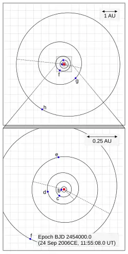 There are no planets known to be in mean-motion resonances, although the system has a number of near resonances[5] including 3c:2i:1d and 3e:2j:1f. The approximate ratios of periods of adjacent orbits are (proceeding outward): 1:5, 1:3, 1:3, 2:5, 1:5, 3:11.