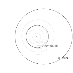 Those two planets are near, and possibly in a 9:2 orbital resonance. This means if HD 108874 b orbits the star nine times, then HD 108874 c orbits twice, because the orbital period for planet c is four and a half times longer than planet b.[6]