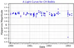 The variability of the brightness of HD 128333 was announced by Joel Stebbins and Charles Morse Huffer in 1928, based on observations made at Washburn Observatory.[10] It was given its variable star designation, CH Boötis, in 1977.[11]