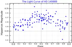 ![]() A light curve of HD 149989 from Hipparcos data, assuming a period of 0.4266 days, adapted from Aerts et al. (1998)[1] | |