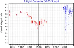 ![]() A visual band light curve for V905 Scorpii. The red points are from Sterken et al. (1997),[1] and the blue points are ASAS data.[2] | |