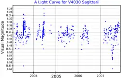 A visual band light curve for V4030 Sagittarii, plotted from ASAS data[11]