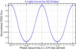 Henning Jorgensen et al. reported that HD 28843 was a "suspected variable star" in 1971.[15] The variability of the star was firmly established in 1977 by Holger Pedersen and Bjarne Thomsen, during a spectroscopic and photometric study of helium weak and helium strong stars. They determined its period to be 1.374±0.006 days.[16] In 1978 the star was given the variable star designation DZ Eridani.[17]