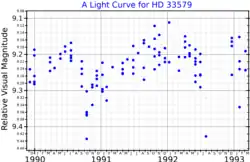Although HD 33579 has not been formally listed in the General Catalogue of Variable Stars, analysis of Hipparcos photometry confirmed small amplitude variations in its brightness that had been reported in earlier research.[13][14][15] Periods of 620 days and 105 days are found, plus other possible shorter periods. The total amplitude is only around 0.1 magnitudes.[6] A statistical analysis of Hipparcos photometry showed a possible period of 27 days.[16]