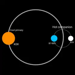 HR 2024 is a spectroscopic binary (more precisely a single-lined spectroscopic binary)[11] made up of a cool primary and a hot secondary, which is also a binary star.[4] The designations “cold” and “hot” refer to the effective temperature of the components. They are separated by 4.7×108 kilometres (3.1 AU), and complete an orbit around each other every 2,570 days (7 years).[6] The orbital eccentricity is equivalent to 0.3.[6]