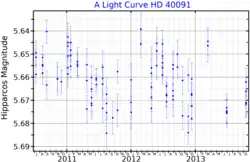 HD 40091 is found to vary between 5.64 and 5.68 in the Hipparcos passband, but it is not confirmed to be a variable star. Therefore, it is catalogued in the GCVS as a suspected variable.[6]