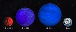 Due to the high radiation received from its host star, the atmosphere of HD 63433 c, made up of hydrogen, is slowly being stripped away and escaping from the planet.[29] The hot gas escapes into space at a velocity of 50 km/s, forming a gas cocoon 12 times larger than the planet itself.[29] As its atmosphere evaporates, HD 63433 c will slowly become a super-Earth planet.[29]