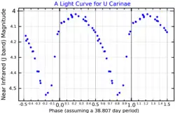 U Car is a δ Cepheid variable with a period of 38.7681 days. Isaac Roberts discovered that the star's brightness varies in 1891,[10] and it was one of the earliest Cepheids to be discovered. It has also one of the longest periods, and hence is one of the most luminous in the class.[11] There are still only a few Cepheids with longer periods, including RS Puppis, SV Vulpeculae, and the unusual S Vulpeculae.[2]