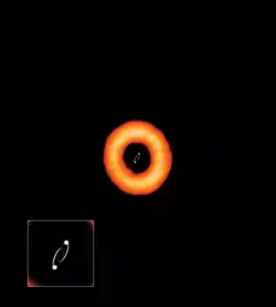 An infrared excess indicative of a debris disk was first discovered by IRAS.[18] Further observations of the system have been made using Keck[19] and the Spitzer Space Telescope.[20] The disk consists of two separate belts. The inner ring extends from a distance of 1.5 to 2 astronomical units from the barycenter of the central binary. The outer ring begins at approximately 5.9 astronomical units from the central binary, and extends out an undetermined distance. The gap between the two rings is ~3 astronomical units. The inner ring is thin, while the inner portion of the outer ring is dense.