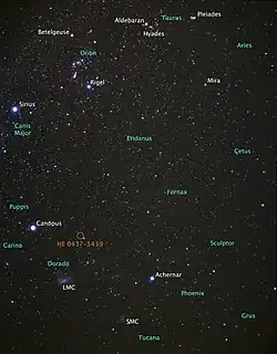 HE 0437−5439 is a massive, unbound hypervelocity star (HVS), also called HVS3.[2] It is a main sequence B-type star located in the Dorado constellation. It was discovered in 2005 with the Kueyen 8.2-metre (320 in) telescope, which is part of the European Southern Observatory's Very Large Telescope array. HE 0437−5439 is a young star, with an age of around 30 million years.[3] The mass of the star is almost nine times greater than the mass of the Sun[4] and the star is located 200,000 light years away in the direction of the Dorado constellation, 16 degrees northwest of the Large Magellanic Cloud (LMC) and farther away than the LMC.[3] The star appears to be receding at an extremely high velocity of 723 kilometres per second (449 mi/s), or 2,600,000 kilometres per hour (1,600,000 mph). At this speed, the star is no longer gravitationally bound and will leave the Milky Way galaxy system and escape into intergalactic space. It was thought to have originated in the LMC and been ejected from it soon after birth. This could happen if it originally was one of a pair of stars and if there is a supermassive black hole in the LMC.[4]