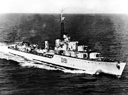 In late June 1950, Bataan was en route to Japan for a fifth tour when the Korean War started.[2] From early July 1950 until 29 May 1951, the destroyer operated off Korea; patrolling and blockading, escorting aircraft carriers, and bombarding shore targets.[2] A second Korean tour occurred between 4 February and 31 August 1952, with Bataan fulfilling most of the same duties as before.[2] Bataan was presented with the battle honour "Korea 1950–52" for her service.[8][9] In November 1953, Bataan visited Singapore.[2] This was the only time since the Korean War, and the only time for the rest of her career, that the destroyer would leave Australian waters.[2]