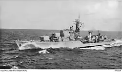 After participating in a week of fleet exercises in mid-January 1970, Duchess began a sequence of port visits: Port Swettenham, Kota Kinabalu, Manila, Bangkok, Hong Kong, Osaka (coinciding with Expo '70), Kobe, and Subic Bay before returning to Singapore.[32] This was followed by SEATO exercises in the South China Sea during March and April.[32] Duchess returned to Sydney on 5 June, and was docked for a refit, which lasted until 8 February 1971.[32] On 18 March, Duchess was again deployed to the Far East.[32] The destroyer met Sydney off Singapore on the troopship's nineteenth on 3 April.[39][40] The two ships arrived in Vũng Tàu on 5 April, and returned to Hong Kong on 8 April.[40][41] After a sequence of port visits, Duchess and Parramatta met Sydney on 17 May for transportation run twenty.[32][40] Vũng Tàu was reached on 22 May, with departure a day later.[42] Duchess sailed to Hong Kong, then on 8 June departed for Australia, arriving on 25 May and commencing a mid-cycle docking which ran until 13 November.[32][40] In January 1972, Duchess joined Melbourne, Stalwart, and Supply for a task group deployment to Asian waters.[32] The deployment included SEATO exercises and port visits to Port Klang and Surabaya, before the ships arrived in Fremantle on 14 April.[32] After proceeding to Sydney for maintenance, Duchess resumed exercising in local waters.[32] During a surface firing exercise on 25 July, a shell from B turret hit one of the elevated barrels of A turret.[32] In August, with her loan period up, Duchess was purchased outright from the Royal Navy for £150,000.[32] After a midshipman training cruise to Port Moresby in August, the ship spent the rest of the year on exercises and training.[32]