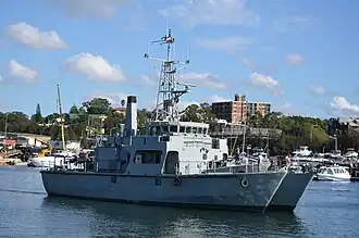 HMAS Rushcutter (M 80) was one of two Bay class minehunters built for the Royal Australian Navy by Carrington Slipways at its Ramsay Fibreglass facility in Tomago, New South Wales.[2] She was launched on 8 May 1986 and commissioned on 1 November 1986.[2] She was decommissioned on 14 August 2001.[2] She and sister ship HMAS Shoalwater were sold in 2002 for service in the Persian Gulf.[3] At some point before 2013, the vessel ended up in private hands in Rozelle Bay.