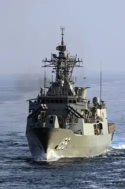 In June 2009, Toowoomba sailed from Fleet Base West, Western Australia to embark upon the ship's second MEAO deployment.[19] In September, the frigate was assigned to Combined Task Force 151 (CTF-151); Toowoomba was the first Australian warship to work with CTF-151, a US-led, multinational force tasked with protecting merchant vessels from pirate attacks off the coast of Somalia.[20] Toowoomba was assigned to escort merchant shipping and conduct overt patrols in the International Recommended Transit Corridor (IRTC), a shipping lane extending the Gulf of Aden towards the Somali Basin and the Horn of Africa, in support of United Nations Security Council Resolutions 1846 and 1851.[20] The frigate also operated with the counter-terrorism Combined Task Force 150 (CTF-150) in the Arabian Sea.[19]