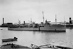 Yarra, along with sister ships Parramatta and Warrego, were ordered on 6 February 1909; the first ships to be ordered for the Commonwealth Naval Forces, the post-Federation amalgamation of the Australian colonial navies.[4] Yarra was laid down by William Denny and Brothers, at their shipyard in Dumbarton.[2] She was launched on 9 April 1910 by the wife of Newton Moore, the Premier of Western Australia.[2] Construction was completed in August 1910, and the ship was commissioned into the Royal Navy as HMS Yarra on 10 September 1910 for the voyage out to Australia.[2] Yarra and Parramatta sailed from Portsmouth on 19 September.[2] Once the ships arrived in Broome, they were transferred to the control of the Commonwealth Naval Forces.[2] The destroyer's name comes from the Yarra River in Victoria.[1]