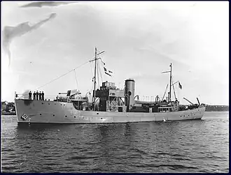 In 1936, new minesweepers were ordered for the Royal Canadian Navy.[3] Based on the British Basset class,[4][5] those built on the east coast would cost $318,000 per vessel.[6] At the outbreak of the Second World War, the Royal Canadian Navy considered constructing more, but chose to build Bangor-class minesweepers instead upon learning of that design due to their oil-burning engines.[4][7][8]