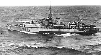 The River-class frigate design was an upgraded version of the Flower-class corvette,[1] remedying many of the Flower class' issues as an ocean escort. The initial vessels were constructed for the Royal Navy and were named for rivers, however, in Canada, they were named for cities.[2] Canada was informed of the design development in December 1940, but the plans were not delivered until late April 1941. The design was too large to fit through the canals on the St. Lawrence River, restricting the construction of the River-class ships to three shipyards, all with direct access to the sea.[3] The first fifteen Canadian ships followed the standard British design.[4]