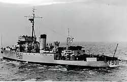 In December 1944, Wallaceburg was reassigned to escort group W-8 and remained with the group until July 1945. In July and August 1945, the vessel was attached to HMCS Cornwallis as a training vessel before being placed in reserve at Sydney, Nova Scotia. The ship was transferred to Halifax and paid off on 7 October 1946.[6] While in reserve, Wallaceburg was maintained as the depot ship for the reserve fleet.[8] In November 1950, Wallaceburg was recommissioned as a cadet training vessel, operating out of Halifax.[9] The vessel returned to reserve, acting as a depot ship before being reactivated again on 4 April 1951 during the Korean War.[10]