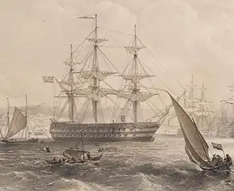 She was initially ordered from Pembroke Dockyard on 3 October 1833 as a 110-gun first rate to a design by Sir William Symonds. On 10 December 1834, the order for Algiers was changed to a 74-gun two decker, but this was changed once more to a 110-gun ship on 5 February 1839. The order was amended once more, to complete her as a 90-gun Albion-class ship of the line on 26 December 1840,[2] and she was laid down at Plymouth Dockyard on 10 July 1843. Her designs were amended once more, and she was re-ordered on 25 April 1847. The Admiralty ordered that she be lengthened and fitted with screw propulsion while under construction on 3 August 1852. The conversion began on 27 September and Algiers was launched on 26 January 1854. The ship was commissioned on 27 May 1853 under Captain Charles Talbot and completed on 30 June 1854. Algiers served as a troopship during the Crimean War, making voyages first to the Baltic Sea and then the Black Sea.[3]
