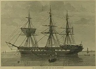 Once decommissioned, in 1874, the ship's engines were removed and she was loaned by the Admiralty to the charity that later became known as Shaftesbury Homes and Arethusa.[1] Retaining the name Arethusa, she was moored next to their existing training ship Chichester at Greenhithe, Kent. Shaftesbury Homes provided refuge and taught maritime skills to destitute young boys who had been sleeping rough on the streets of London and trained them for a career in the Royal Navy or Merchant Navy.