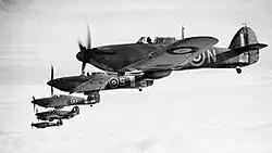 On 18 April 1942, Avenger started flight deck landing training with four Fairey Swordfish aircraft of 816 Naval Air Squadron, Fleet Air Arm. The exercise had to be curtailed when her engines broke down. Repaired by 30 April 1942, she joined the escort for convoy AT 15 to cross the Atlantic to Britain. During the crossing the Swordfish of 816 Squadron provided anti-submarine patrols. On 4 May, two aircraft lost the convoy in heavy weather and requested a homing beacon from Avenger. She was unable to help, not having the correct equipment, and both aircraft and crews were reported missing.[4] When Avenger arrived in Britain the Fleet Air Arm had a shortage of Martlet fighter aircraft, so a small number of Royal Air Force Hawker Hurricanes were converted into Sea Hurricanes. Avenger was chosen to test their deck landing ability on escort carriers. The tests, flown by Eric "Winkle" Brown,[6] were successful, and the Sea Hurricane equipped 802 Naval Air Squadron and 882 Naval Air Squadron, with 12 aircraft assigned to Avenger. They were joined by three Fairey Swordfish and five crews from 825 Naval Air Squadron.[7][nb 1]