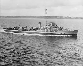 The ship's main gun armament consisted of three 3-inch (76 mm) 50 caliber dual-purpose (i.e. anti-surface and anti-aircraft) guns, two forward and one aft, in open mounts. Close in armament consisted of two 40 mm Bofors guns, backed by eight single Oerlikon 20 mm cannon. A triple mount of 21-inch (533 mm) torpedo tubes provided a capability against larger ships, while anti-submarine armament consisted of a Hedgehog forward-firing anti-submarine mortar and four depth charge throwers and two depth charge rails.[3][4] Crew was 200 officers and other ranks.[3]