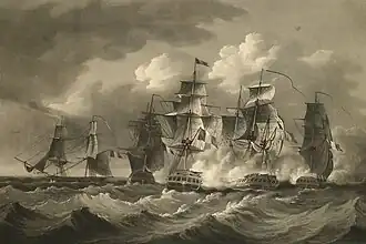 Mudge initially took the French squadron to be a British convoy that had also been sailing in the area, and he moved towards the ships.[32] When the French began closing with him and ignored Blanche's signals Mudge realised his mistake and attempted to run from the superior force. Blanche had lost almost all her copper sheathing in the previous nine months of service, and as such she sailed very poorly and the French were easily able to catch up with the frigate. The battle began at about 11 a.m. when Topaze reached Blanche, exchanging broadsides on the British ship's starboard side. Départment des Landes came up and occupied Blanche's starboard quarter and stern alongside Topaze, attacking with their chase guns. Faune did not close with the British frigate. After half an hour of battle Blanche attempted to get across Topaze's bow to rake her, but as she manoeuvred, the French vessel luffed up behind Blanche and achieved a raking fire of her own through Blanche's stern. The battle continued for forty-five minutes, with the French destroying all of Blanche's sails and rigging, leaving her unable to manoeuvre and her fore and main masts disabled.[31][32][34]