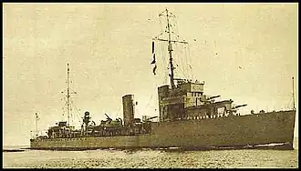 After trials and workup, Broke was ordered to the Mediterranean, arriving at Malta on 9 February 1925 and replacing Montrose as leader of the 4th Destroyer Flotilla. She was refitted at Malta dockyard from May to August 1929 and again from November 1930 to March 1931. Broke left the 4th Flotilla and returned to British waters in April 1931, going into reserve at Devonport. While in reserve, she acted as tender to the Royal Naval Engineering College at Keyham, Plymouth until April 1932, and then served as Emergency destroyer at Devonport.[14] In June 1935 Broke received a full crew, and was allocated as an independent command (i.e. not part of any Flotilla) as part of the Reserve Fleet. She served as the flagship for the Rear Admiral (D) of the Reserve Fleet during the Royal Fleet Review in July 1935, before returning to local duties around Portsmouth.[18] In October 1935, HMS Broke starred as the fictional "Second-class cruiser HMS Rutland" in the film Forever England based upon C. S. Forester's novel Brown on Resolution, with John Mills playing Able Seaman Brown in his first leading role.[19][20][21]
