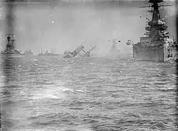 Campania failed to receive the signal to deploy when the Grand Fleet departed Scapa Flow on 30 May 1916 en route to the Battle of Jutland, but she sailed two hours and fifteen minutes later. Even though she was slowly overtaking the fleet early in the morning of 31 May, she was ordered to return to Scapa Flow as she lacked an escort and German submarines had been reported in the area.[6] The ship participated in some anti-submarine and anti-Zeppelin patrols, but she was later declared unfit for fleet duty because of her defective machinery and became a seaplane training and balloon depot ship.[5] In April 1918 Campania, along with the Grand Fleet, was transferred from Scapa Flow to Rosyth.[7]