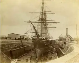 ![]() HMS Canada in dry-dock, Halifax Graving Yards, Halifax, Nova Scotia, 1889[1]