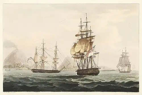 On 28 May Caroline was in sight of the ship-of-the-line HMS Victory as she captured the French frigate L'Ambuscade, previously the British HMS Ambuscade, and thus shared in the prize of her.[53] A day later she captured the French merchant brig La Bonne Mere.[35] Caroline took the 6-gun privateer Haasje off the Cape of Good Hope on 2 August while on voyage; Haasje had been bound for India with dispatches from Napoleon.[1][54][55] Haasje was sent in to Saint Helena, where the news of war she carried caused Dutch ships to be impounded and English merchant ships to stop sailing out of convoys.[54] No longer having to keep her knowledge of the war secret, the ship detained the Dutch merchant Henrica Johanna on 3 August.[Note 6][56] The passage to the East Indies took 103 days, with Caroline only stopping briefly at Madeira for water and wine.[50] Here Caroline sent dignitaries to the governor of the island, only for the representatives to mistake the governor's butler for him.[57] The frigate completed the voyage of 13,000 miles without losing any men to sickness, for which the discipline and cleanliness of the ship were praised.[58] The ship arrived in the East Indies on 6 September and took the French merchant Petite Africaine a day later.[59][60]