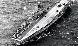 Between June 1956 and August 1958 Centaur underwent her partial modernisation at Devonport Dockyard. This involved the installation of two 139-foot (42 m) BS4 40,000 lb (18,000 kg) steam catapults forward, the removal of the Bofors guns on the flight deck, improved air operations facilities and the addition of a Type 963 blind-landing radome at the rear of the island.[18][19][20] Some work was also done on a further slight extension on the port side, to enable a six-degree angled flight deck to be used.[21] Her arrestor cables were not upgraded at this stage, however. This was rectified in her 1960–1961 refit, when five 35,000 lb (16,000 kg) arrestor wires were fitted.[22][23]