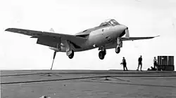 Centaur recommissioned at Devonport on 3 September 1958, under the command of Captain Horace Law.[24] Following the completion of post-refit ship trials in the Channel and South-West Approaches in November, she embarked her air group in preparation for her flying trials, which included visits from both Sea Vixens and Scimitars as well as two Gannet AEW3s. In January 1959 she embarked her full air-group, consisting of fourteen Hawker Sea Hawk FGA6s of 801 Squadron, eight Sea Venom FAW22s of 891 Squadron, eight Westland Whirlwind HS7s of 845 Squadron and four Douglas Skyraider AEW1s of D Flight 849 Squadron.[25][26]