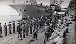Centaur's initial air group of 25 aircraft, as embarked in July 1954, consisted of nine Hawker Sea Hawk FGA6 of 806 Squadron, nine Hawker Sea Fury FB11 of 810 Squadron, six Grumman Avenger AS anti-submarine aircraft of 820 Squadron and one Westland Dragonfly HR5 of the ship's flight.[5] Centaur was initially intended to join the Mediterranean Fleet for a period of four months, before heading east of Suez to relieve Warrior as the duty carrier in the Far East. As events transpired however, she was to remain in the Mediterranean until June 1955. Her activities during this period included exercises in company with her sister ship Albion and NATO allies, embarking British troops during the withdrawal from Trieste in October 1954, escorting the royal yacht Britannia during a Royal Tour and numerous visits to friendly ports.[6] Whilst at Malta in February 1955 the Sea Furys of 810 Squadron were disembarked and the squadron later flew back to the UK to be disbanded; they were replaced by nine Sea Hawks of 803 Squadron which were transferred from Albion in March 1955. The Avenger AS4s of 820 Squadron were similarly replaced by six Avenger AS5s of 814 Squadron.[7]