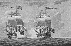Centurion was recommissioned in September 1746, and placed under the command of Captain Peter Denis.[3] She was present at the Battle of Cape Finisterre on 3 May 1747, as part of fleet under her old commander, now Rear-Admiral George Anson.[3] She played a significant role, as described in a topical song of the time: