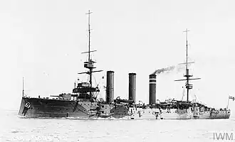 Donegal, named to commemorate County Donegal,[7] was laid down by Fairfield Shipbuilding & Engineering at their Govan shipyard on 14 February 1901 and launched on 4 September 1902, when she was named by the Duchess of Abercorn, wife of the Lord-Lieutenant of County Donegal (James Hamilton, 2nd Duke of Abercorn).[8] She was completed on 5 November 1903[1] and was initially assigned to the 1st Cruiser Squadron of the Channel Fleet.[9] Whilst en route to the China Station, she ran aground at Suez, Egypt on 2 March 1906[7] and had to return to Chatham Dockyard for repairs. The ship was briefly placed in reserve before she was assigned to the Home Fleet in 1907. Donegal was transferred to the 4th Cruiser Squadron on the North America and West Indies Station in 1909[9] and collided with the merchant ship SS Malaga at Gibraltar on 8 December.[7] She returned home in 1912 for service with the Training Squadron of Home Fleet and sank the derelict merchantman SS Volturno with gunfire in October 1913.[10] The ship was assigned to the reserve Third Fleet before the beginning of World War I in August 1914.[7]
