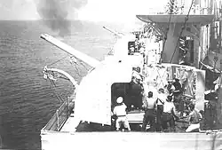 Shortly thereafter, Dorsetshire took part in Bismarck's last battle; after the battleships Rodney and King George V neutralised Bismarck's main battery early in the engagement, Dorsetshire and other warships—including her sister Norfolk—closed in to join the attack.[1] Dorsetshire opened fire at a range of 20,000 yd (18,000 m), but poor visibility forced her to check her fire for lengthy periods.[21] In the course of the engagement, she fired 254 shells from her main battery. In the final moments of the battle, she was ordered to move closer and torpedo Bismarck and fired three torpedoes, two of which hit the crippled battleship.[1][22] The Germans had by this time detonated scuttling charges, which with the damage inflicted by the British, caused Bismarck to rapidly sink at 10:40.[23]