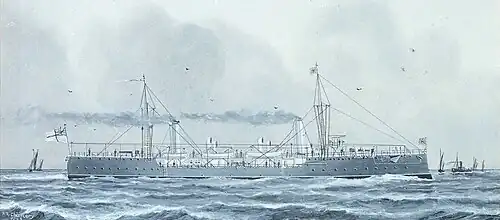 Dryad deployed to Crete in February 1897 to operate as part of the International Squadron, a multinational force made up of ships of the Austro-Hungarian Navy, French Navy, Imperial German Navy, Italian Royal Navy (Regia Marina), Imperial Russian Navy, and Royal Navy that intervened in the 1897–1898 Greek uprising on Crete against rule by the Ottoman Empire. On 21 February 1897, she joined the British battleship HMS Revenge and torpedo gunboat HMS Harrier, the Russian battleship Imperator Aleksandr II, the Austro-Hungarian armored cruiser SMS Kaiserin und Königin Maria Theresia, and the German protected cruiser SMS Kaiserin Augusta in the International Squadron's first direct offensive action, a brief bombardment of Cretan insurgent positions on the heights east of Canea (now Chania) after the insurgents refused the squadron's order to take down a Greek flag they had raised.[2][3]