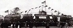 On 27 April 1916, the German submarine UC-5, under the command of Oberleutnant zur See Ulrich Mohrbutter, ran aground on Shipwash Shoal in position 52°03′N 01°46′E / 52.050°N 1.767°E / 52.050; 1.767 (SM UC-5).[12] Firedrake captured the U-boat at 1:00pm relatively intact; apart from some damage incurred in the grounding, the crew had taken measures to damage instruments and equipment, including firing small arms at them,[13] and seven destruction charges had caused several holes in the pressure hull. UC-5 was towed to Harwich and placed in a dry dock, where she was examined and reconditioned. She was displayed at Temple Pier on the Thames in London, and later moved to New York, where she was displayed in Central Park.[14] Firedrake's captain, Commander Aubrey Thomas Tillard was mentioned in despatches for his part in the capture.