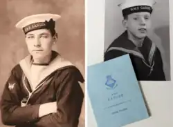 ![]() Bill Jordan, the New Zealand High Commissioner, with a group of New Zealand sailors in front of the masthead and figurehead of HMS Ganges.