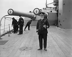 After the battle, the ship was transferred to the 4th BS and became the flagship of its commander, Vice-Admiral Sir Doveton Sturdee.[13] The Grand Fleet sortied on 18 August to ambush the High Seas Fleet while it advanced into the southern North Sea, but a series of miscommunications and mistakes prevented Jellicoe from intercepting the German fleet before it returned to port.[24] During this foray, Hercules carried out the first test of a towed kite balloon (without observers).[13] Two light cruisers were sunk by German U-boats during the operation, prompting Jellicoe to decide to not risk the major units of the fleet south of 55° 30' North due to the prevalence of German submarines and mines. The Admiralty concurred and stipulated that the Grand Fleet would not sortie unless the German fleet was attempting an invasion of Britain or there was a strong possibility it could be forced into an engagement under suitable conditions.[25]