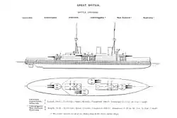 The Indefatigable class had a main armament of eight breech-loading BL 12-inch (305 mm) Mark X guns mounted in four hydraulically powered twin-gun turrets. Two turrets were mounted fore and aft on the centreline, identified as 'A' and 'X' respectively. The other two were wing turrets mounted amidships and staggered diagonally: 'P' was forward and to port of the centre funnel, while 'Q' was situated starboard and aft. 'P' and 'Q' turrets had some limited ability to fire to the opposite side. Their secondary armament consisted of sixteen BL 4-inch (102 mm) Mark VII guns positioned in the superstructure.[5] They mounted two 17.72-inch (450 mm) submerged torpedo tubes, one on each side aft of 'X' barbette, and twelve torpedoes were carried.[6]