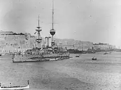 HMS Jupiter was laid down by J & G Thomson, Clydebank at Clydebank on 26 April 1894 and launched on 18 November 1895.[3] In February 1897 she was transferred to Chatham Dockyard,[4] where she was completed in May 1897.[3] She was commissioned on 8 June 1897 at Chatham Dockyard for service in the Channel Fleet. She was present at both the Fleet Review at Spithead for the Diamond Jubilee of Queen Victoria on 26 June 1897 and the Coronation Fleet Review for King Edward VII on 16 August 1902.[5][4] Captain John Durnford was appointed in command in October 1899, followed by Captain Sir Archibald Berkeley Milne from December 1900. In March 1901 she visited Cork.[6] The following year she was part of a squadron visiting Nauplia and Souda Bay at Crete for combined manoeuvres between the Channel and Mediterranean fleets in September and October.[7] Captain Sir Richard Poore was appointed in command in December 1902.[8] On 1 January 1905, the Channel Fleet became the new Atlantic Fleet, making her an Atlantic Fleet unit. She was paid off at Chatham on 27 February 1905 to undergo a refit there, and her Atlantic Fleet service ended when she emerged from refit and was commissioned at Chatham into the Portsmouth Reserve on 15 August 1905. Jupiter was commissioned for service in the new Channel Fleet on 20 September 1905. This service ended on 3 February 1908 when she was paid off.[4] By this time, Jupiter had been surpassed in the role of front-line battleship by the new "all-big-gun" dreadnought battleships inaugurated by HMS Dreadnought in 1906.[9]