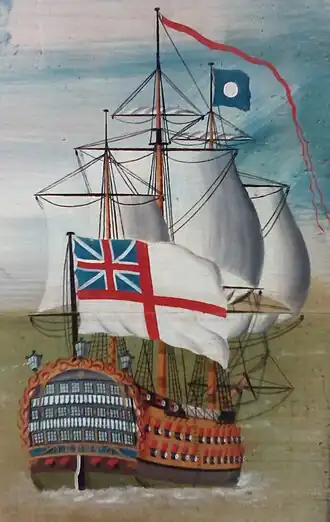 ![]() HMS Kent flying the White Ensign (including the pre-1801 Union Flag), from 'The Fleet Offshore' (1780–1790), a piece of anonymous folk art now at Compton Verney Art Gallery.